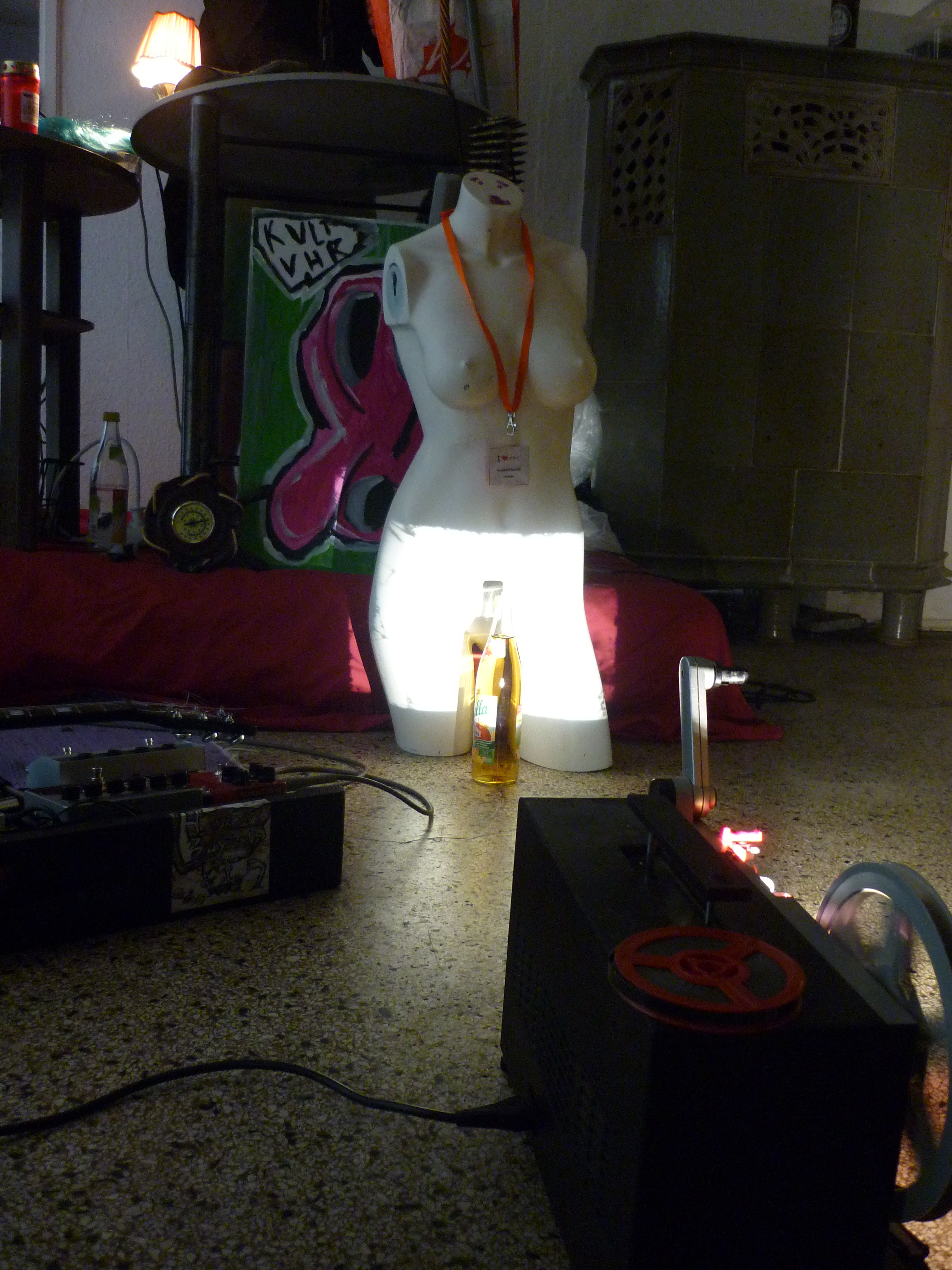 Die Saat war also gesetzt, jetzt musste der Boden nur noch getränkt werden. Auch hier erwies sich Sübkültür als optimal, denn welcher Veranstalter, bitteschön, fragt schon im Vornherein bei den Künstlern spezielle Getränkewünsche ab? Insofern frisch gestärkt, innerhalb der letzten Vorbereitungsstunde mit den Jungs entschieden, wie und in welche Richtung wir die Räumlichkeiten bespielen, den guten alten Blaumann angezogen, die Gitarren und mehrere autarke Planen in den diversen Räumlichkeiten verteilt, die Tretminen ausgeteilt und scharfgestellt, den Kassettenrekorder mit Daliah Lavi bestückt, die Bildzeitung auf den Plätzen verteilt, mit dem schon eintrudelnden Publikum über Kunst gefaselt, schnell noch ne Installation aus Vorgefundenem (einem weiblichen Schaufenster-Puppen-Torso, einer Halbliterflasche Apfelschorle und einem 8mm-Filmprojektor) gezaubert, das Ensemble per Zettel auf „Apfelschorle-Pumpe/Pipi-Sinfonie“ getauft, die im Flur durchhängende Malerfolie als autarke Plane identifiziert und auf „Bück Dich für die Kunst“ getauft, zwischendurch gemerkt, dass Studentinnen von mir im Publikum sind — Performance-Modus! Nichts ist peinlich! — und dann endlich um halb neun, nach einigem Genoise und Geschwurbel füllten sich die Räume mit Publikum. Und wir drei Maskierten sitzen da in diesem Ladenlokal in einem Raum voller Leute und wissen wie immer nicht, was wir da gleich tun werden… Yay!