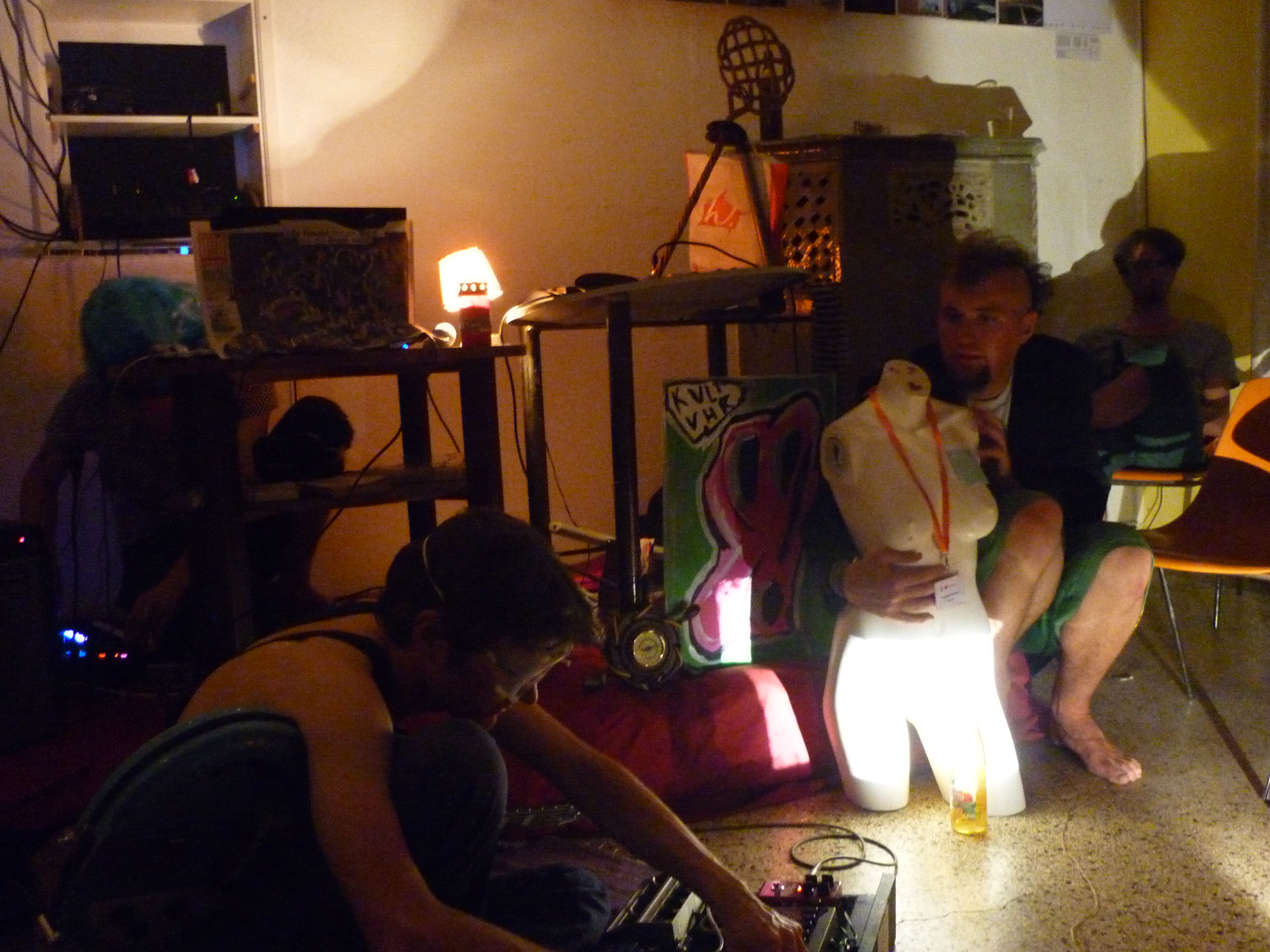 Auch wollten wir die Sache ursprünglich mit vier Leuten angehen, aber auch das erledigte sich drei Tage vorher. Naja… dann halt mit dreien, Thaddäus, Andi und mir. Das gab der Sache wiederum eine Drift Richtung verquaster Performance, alberner Verkleidung und sinnentleerter Atonalität, also all die Sachen, die man so spontan macht, und die einen später normalerweise beim Nachhören der Mitschnitte mitunter zum Haareraufen/Mitgrölen/Lachkrampfen bringen.