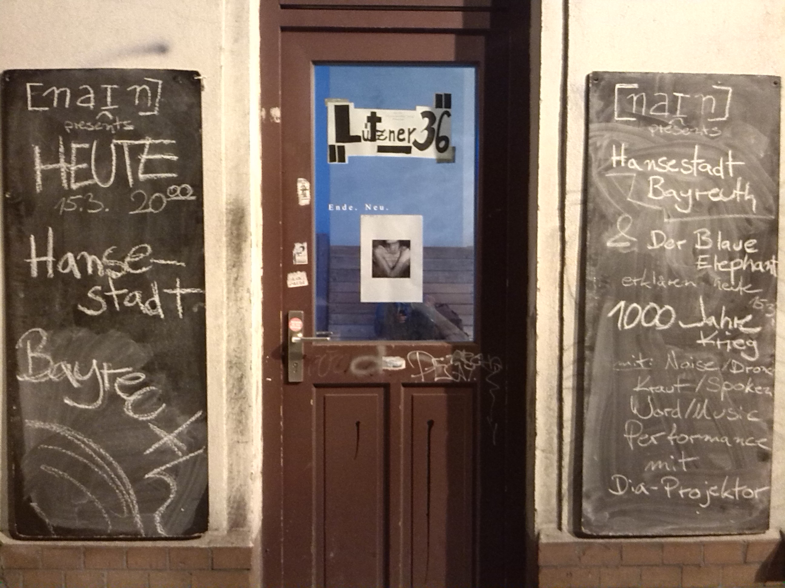 Jetzt haben wir Andis Drohnen-Idee, nachdem sie andernorts von den Veranstaltern zensiert wurde, nun doch über die Bühne gebracht. Anlass dafür war die (u.a. vom Bayreuther Stadtschreiber Volker Strübing *namedrop* ins Leben gerufene und über einen Verein fundierte) Sübkültür-Reihe in der Galerie des Forum Phoinix. Die Sübkültürellen kamen auf uns zu, weil sie Wundersames von uns gehört hatten. Und ich wollte eh mal die Phoinix-Leute kennenlernen, dazu im Doppelpack noch den neuen Sübkültürlern und dem Herrn Strübing, der übrigens auch ein richtig guter SF-Autor ist, die Hand schütteln. Mit der endgültigen Drohnenablieferung also ein guter Grund, den netzwerkerischen Triplekick zu tätigen, zumal uns im Vorfeld gesagt wurde, dass — zwei Tage vor den Merkelfestspielen — auch vielleicht der ein oder andere überregional agierende Journalist dazustoßen könnte. Letzteres hat sich leider nicht bewahrheitet — was hätte da Feuilleton-Prosa entstehen können? –, dafür war für unsere Verhältnisse fantastisch viel Publikum zugegen. Oder genauer gesagt: Die Bude war rappelvoll. Oder noch genauer: Alles Publikum, das uns bislang irgendwo gehört hat, zusammengerechnet und dann noch eine Handvoll drauf, und man hätte die Zahl erreicht, die nun an diesem Abend zugegegen war. Nicht nur diesbezüglich wurde es ein Abend der Superlative.